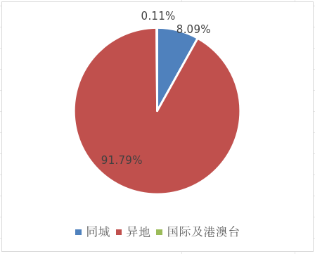 1-12月,同城、异地、国际/港澳台快递业务量分别占全部快递业务量的8.09%、91.79%和0.11%。与去年同期相比,同城快递业务量的比重下降1.13个百分点,异地快递业务量的比重上升1.25个百分点,国际/港澳台业务量的比重下降0.11个百分点。