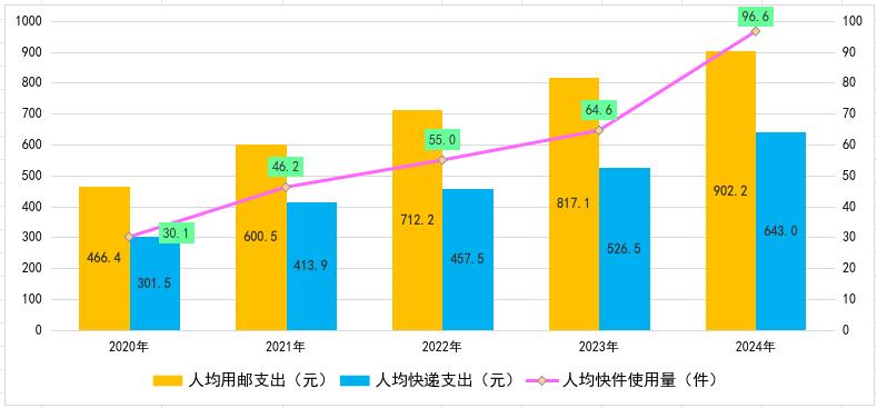 2020-2024年人均用邮支出、快递支出和快递使用量情况