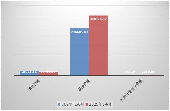 1-6月,同城快递业务量累计完成2.05亿件,同比下降13.68%;异地快递业务量累计完成30.1亿件,同比增长27.20%;国际/港澳台快递业务量累计完成1330.68万件,同比增长285.38%。